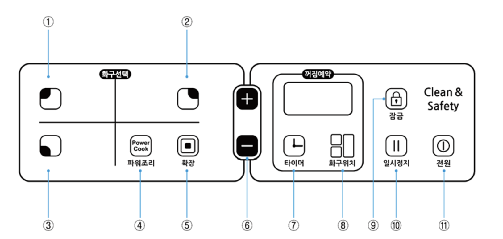 (10) 일시정지 버튼을 누르면 모든 화구가 일시 정지되며, 10분이 지나면 모든 화구가 꺼집니다.